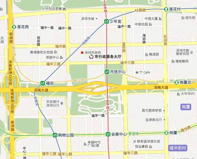 一、深圳市行政服务大厅位置示意图  交通路线图 深圳市行政服务大厅位于福田区福中三路市民中心B区南侧首层,分为东厅和西厅 二、办事窗口分布及服务电话
